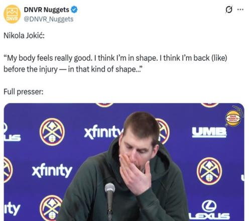 好在约基奇状态明显正在回暖,赛后约基奇表示自己的身体感觉非常好,正在恢复到受伤前的那种状态。